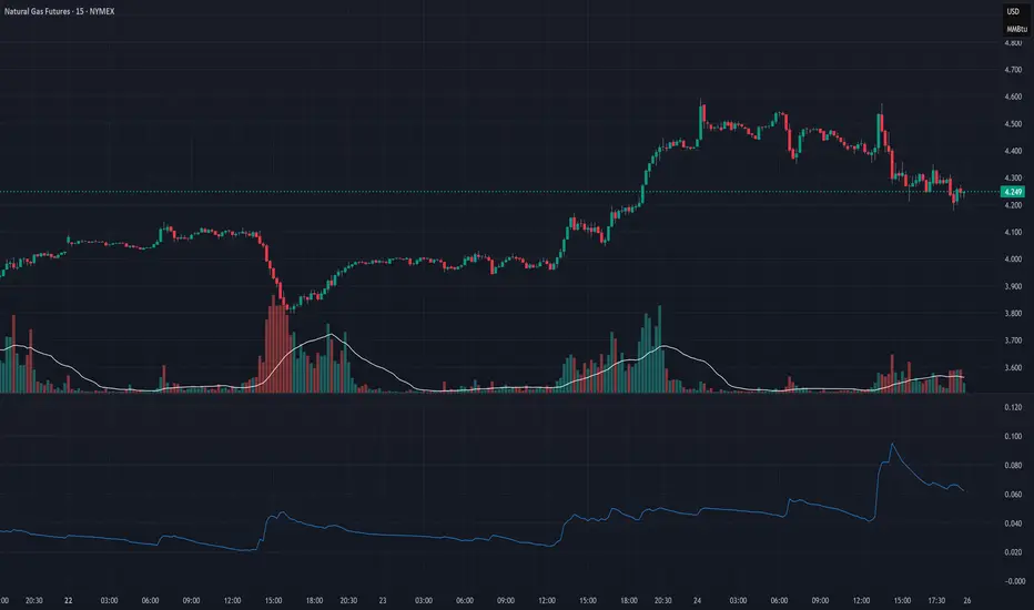 The core of the calculation starts with the standard true range, which captures the most meaningful price movement of each bar. This true range is then multiplied by volume, creating a volume‑weighted true range that gives more importance to bars where market participation is higher. To ensure consistency, the script defines a custom moving‑average function that applies the selected smoothing method to any input series. This function is used twice: once to smooth the volume‑weighted true range and once to smooth volume itself.
