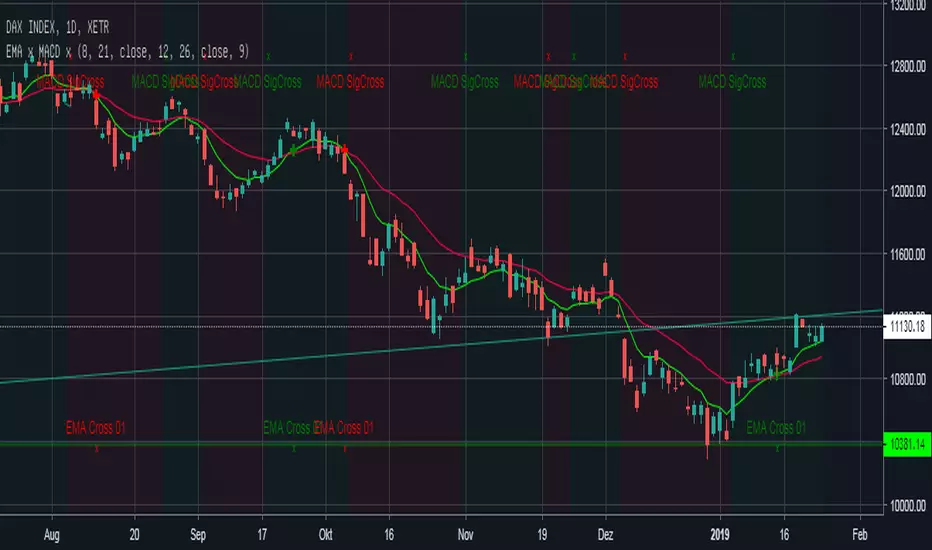 Einfacher EMA-Cross Indikator mit Indikation der Crosses auf EMA-Linie und am Chart-Bottom +