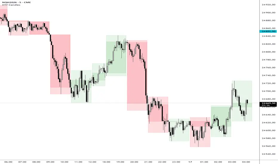 HTF Candle Boxes overlays Higher Time Frame candles as boxes on your Lower Time Frame chart, with independent border and fill colors for bullish and bearish candles, optional body boxes, midline, H/L range display, and a Live Mode that pre-draws the current HTF candle in real time.