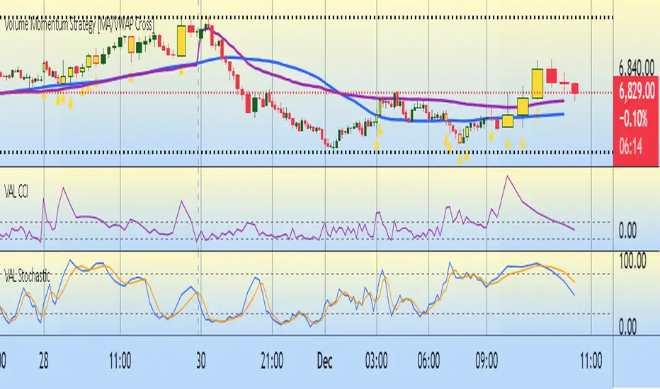 The "Volume Momentum Strategy" is a hybrid system. It executes trades based on the reliable trend signal of MA crossing VWAP but informs the trader with advanced volume analytics. By processing volume through the CCI and Stochastic calculations, it provides a "heads-up" display regarding the intensity of market participation, allowing the trader to distinguish between low-volume drifts and high-volume breakout moves.