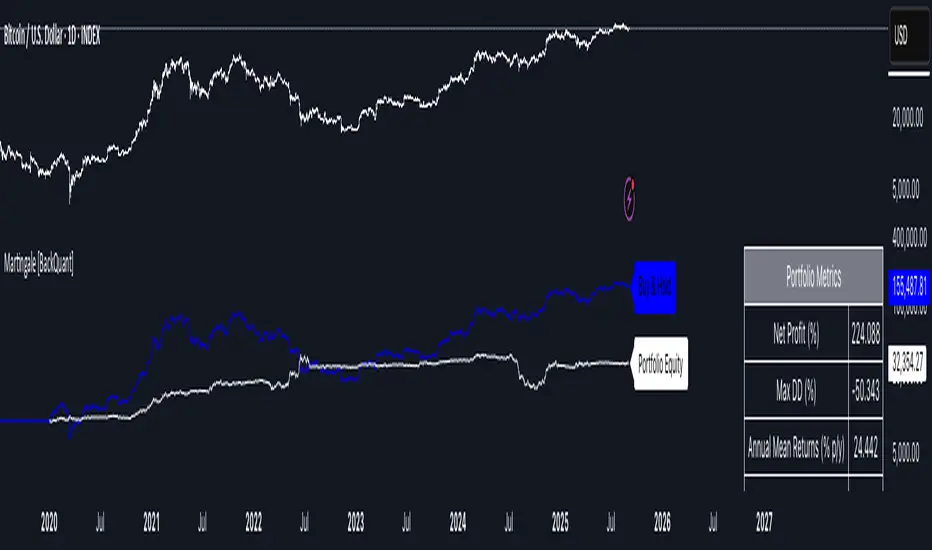 This indicator lets you study how a martingale-style position sizing rule interacts with a simple long or short trading signal. It computes an equity curve from bar-to-bar returns, adapts position size after losing streaks, caps exposure at a user limit, and summarizes risk with portfolio metrics. An optional Monte Carlo module projects possible future equity paths from your realized daily returns.