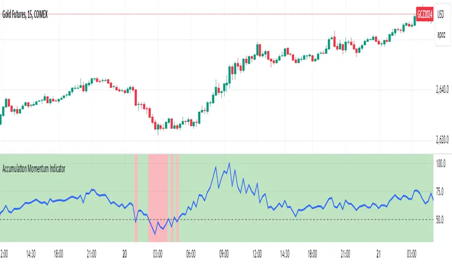 I hope the flexibility and the combination of 4 strong Accumulation Momentum indicators helps you better gauge the direction a commodity might head. The way it's used is when the Accumulation Momentum line is Above 50 buying pressure is stronger then selling pressure. An Accumulation Momentum line Below 50 suggests that distribution is more dominant in the current market. This indicator combines four different methods of analyzing price and volume to give you a single composite momentum score, making it easier to visualize when a commodity is being accumulated or distributed and how quickly this process is happening. It helps you track market sentiment based on both price movement and volume, with a clear, visual representation of buying and selling pressure.