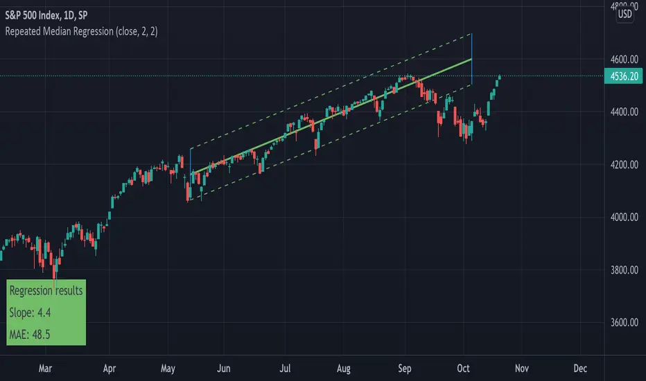 The script uses an algorithm known as Repeated Median Regression. It belongs to the class of so-called robust regression methods. The reason they are called “robust” is that these methods are much less sensitive to outliers in the data than the ordinary least squares.