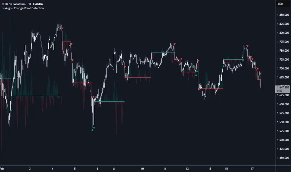 The Change-Point Detection (CUSUM) indicator is a statistical tool designed to detect structural changes in price trends by accumulating deviations from a mean, allowing for the identification of regime shifts before they become obvious to the naked eye.