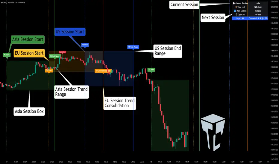 A powerful, real-time market session visualization tool tailored for crypto traders. Track the heartbeat of Asia, Europe, and US trading hours directly on your chart with live session boxes, behavioral analysis, liquidity grab detection, and countdown timers. Know when the action starts, how the market behaves, and where the traps lie.
