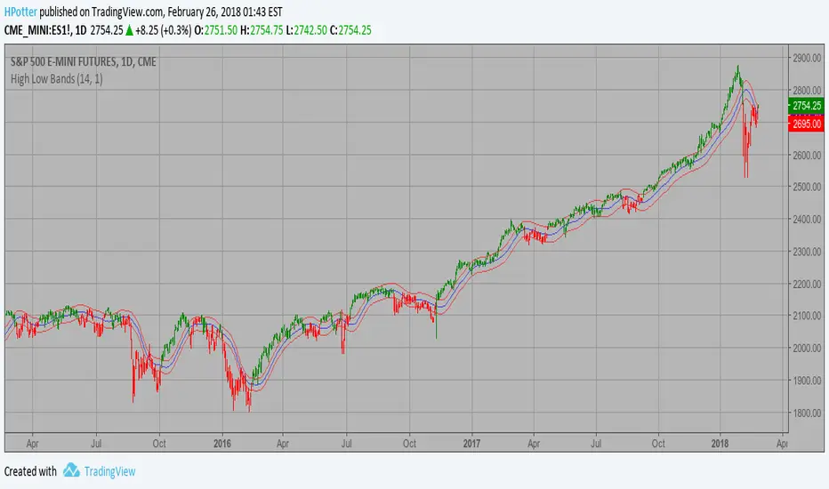 As the name suggests, High low bands are two bands surrounding the underlying’s price. These bands are generated from the triangular moving averages calculated