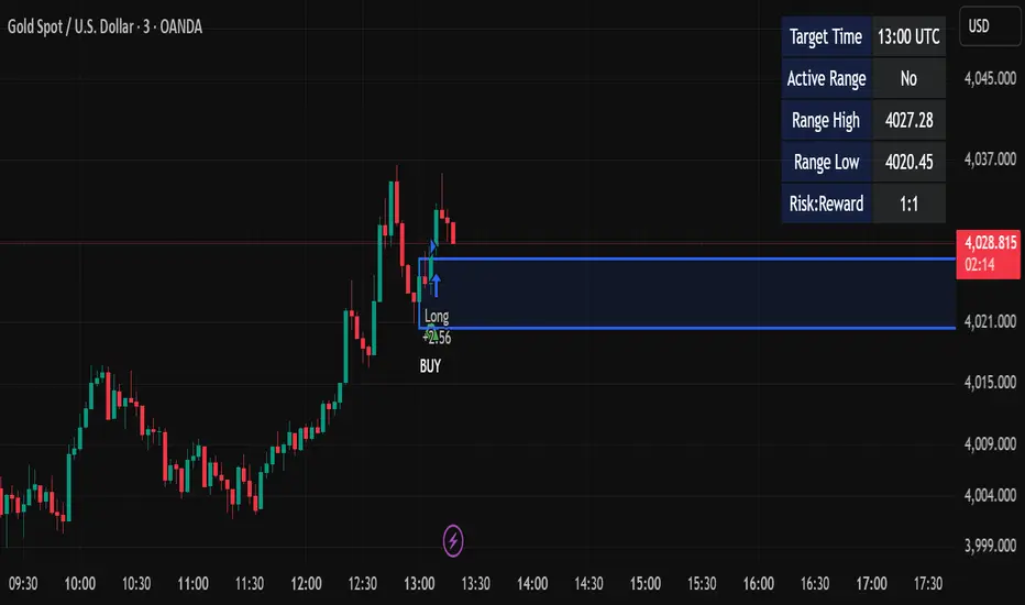 This strategy is intended for breakout style trading where a clearly defined intraday range is established at a fixed time. It is simple, transparent and easy to adapt to multiple symbols and timeframes.