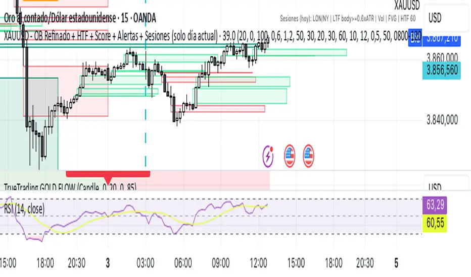 Indicador para XAUUSD que valora los OB y FVG dando puntos de entrada tanto en compras como en ventas en las sesiones de NY y Londres