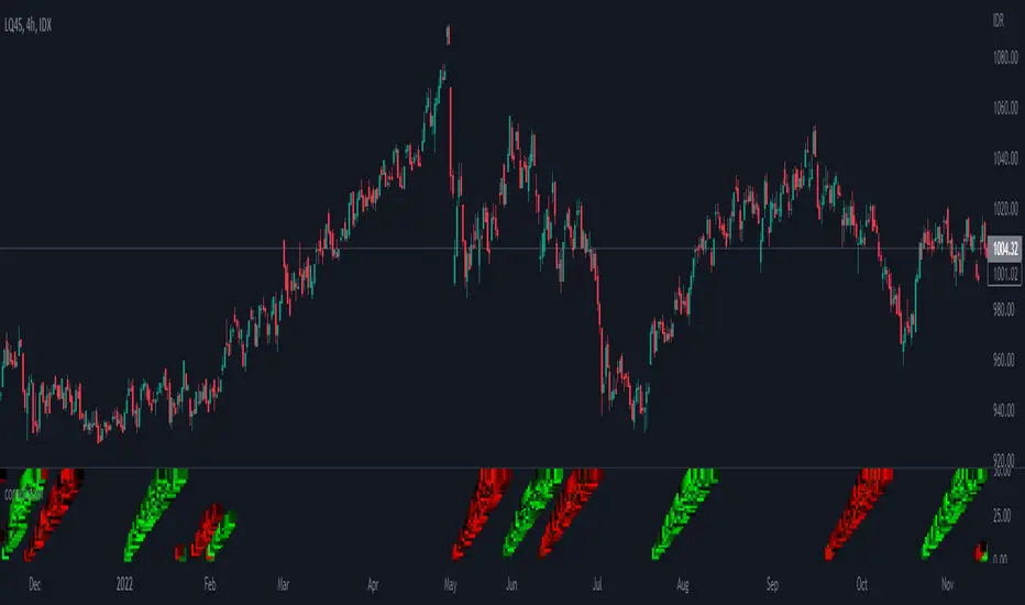 Convolution indicators aim to identify a major reversal in the price direction so that one can trade the market primarily in the direction of the ensuing trend, as described in the Cycle Analytics for Traders, by John F. Ehlers pg. 165. The notion is based on the concept of the two price segments are perfectly correlated (cross-correlated) that have been folded at the horizontal point, since high correlation exists only at the market turning point, e.g. price decreases linearly until the bottom is reached and then increases linearly after the bottom occurs and vice versa. The vertical scale is the lookback period, while the value is converted to colors.