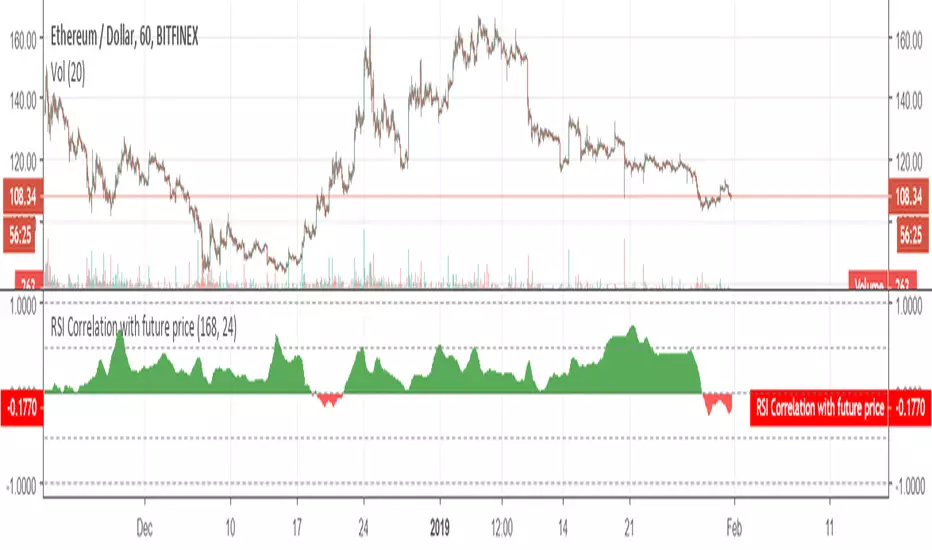 This script measures the correlation of the hourly RSI of 24 hours ago with the difference of price between now and the price 24 hours ago. In other words, this is an indicator which measures the predictive power of the RSI.