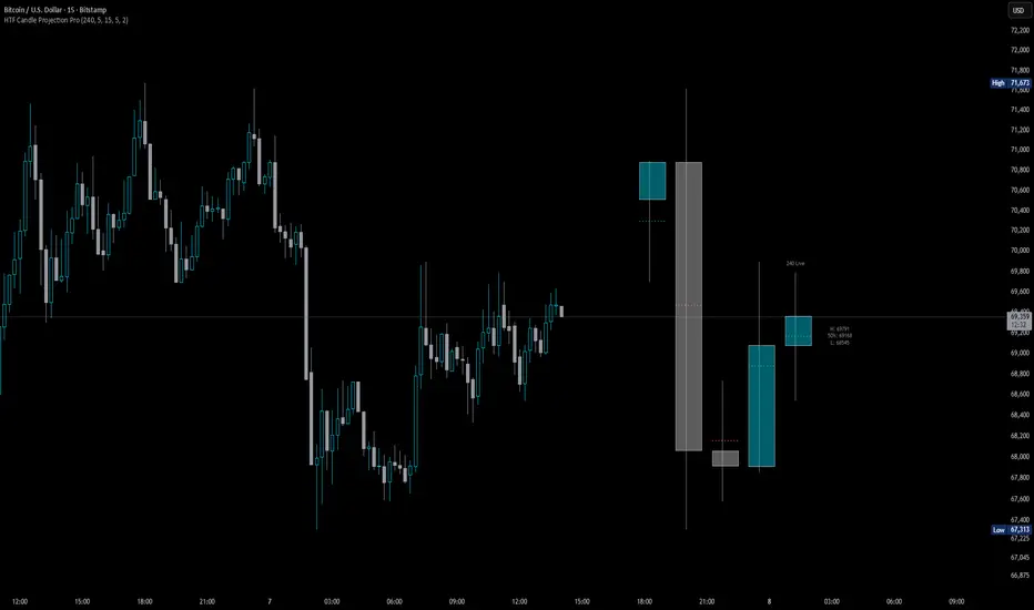 It projects higher-timeframe candles directly onto lower-timeframe charts while preserving clarity, allowing you to monitor HTF behavior, mean interaction, and directional bias without switching charts.