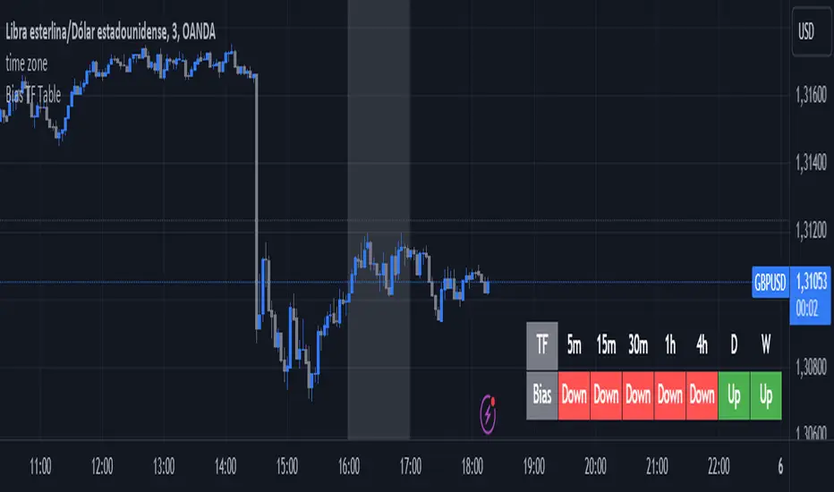 Directional Bias: Displays whether the trend is bullish (Up) or bearish (Down) for each time frame, using the closing price in comparison to a 50-period exponential moving average (EMA).