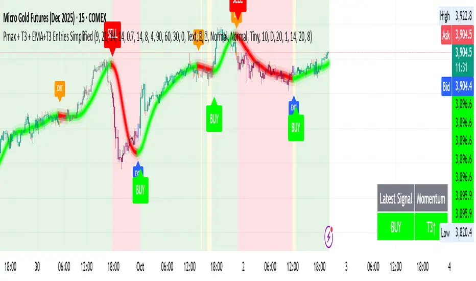 Pmax + T3 is a versatile hybrid trend-momentum indicator that overlays two complementary systems on your price chart: