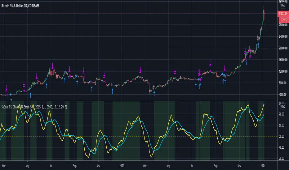 The default values for RSI EMA , RSI SMA and price EMA gave the best return (start out with an amount of x coins in 2015 and end up with the biggest possible amount of coins today). Again, this was only tested on daily. Feel free to tweak these when using other timeframes or other coins