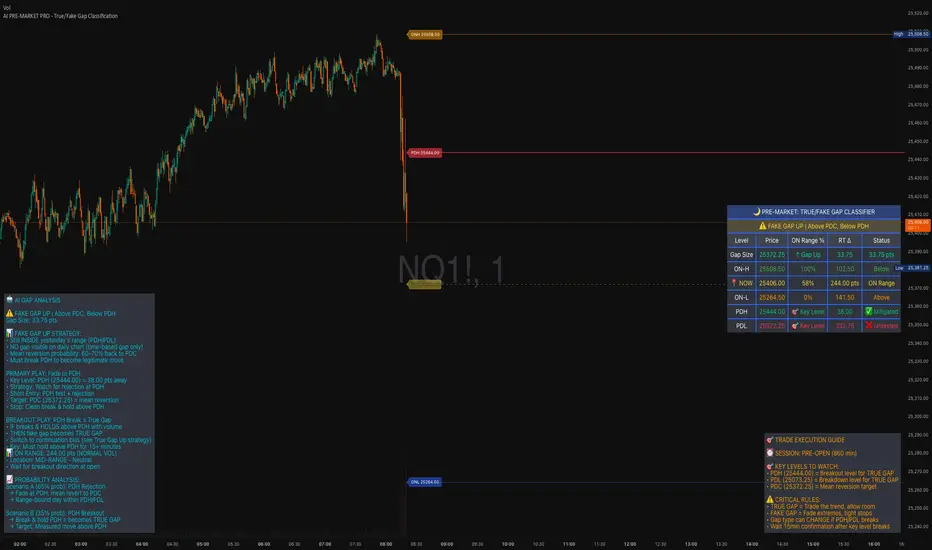 | **Fake Gap Up** | **Fade/Range** | Short the rejection of **PDH** or **ONH**; target **PDC**. |