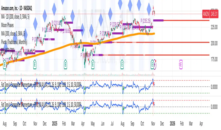 Fat Tony's Composite Momentum + ROC is a sophisticated momentum oscillator that combines multiple technical indicators into a single, volume-weighted signal. This indicator helps traders identify overbought/oversold conditions and potential reversal points by synthesizing Williams %R, Stochastic, MACD, and Rate of Change (ROC) into one composite reading.