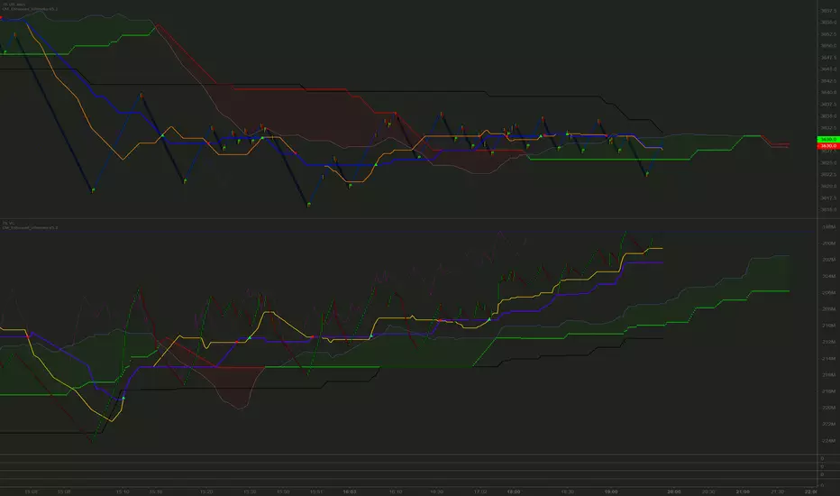 This is the same continuation of CM ichimoku you can find around, fixed little issues here and there, specially removed the check marks from input section (when you give access to styles no need for that), made the cloud color logic much simpler than what I found in 5.2 (seriously), changed the numbers to better fit my renko based system, and finally, the most important part, added an input section so now the users can choose ANY indicator/oscillator as input for ichi IF they want to (in the picture above you can see it working on my volume candle at the same time)