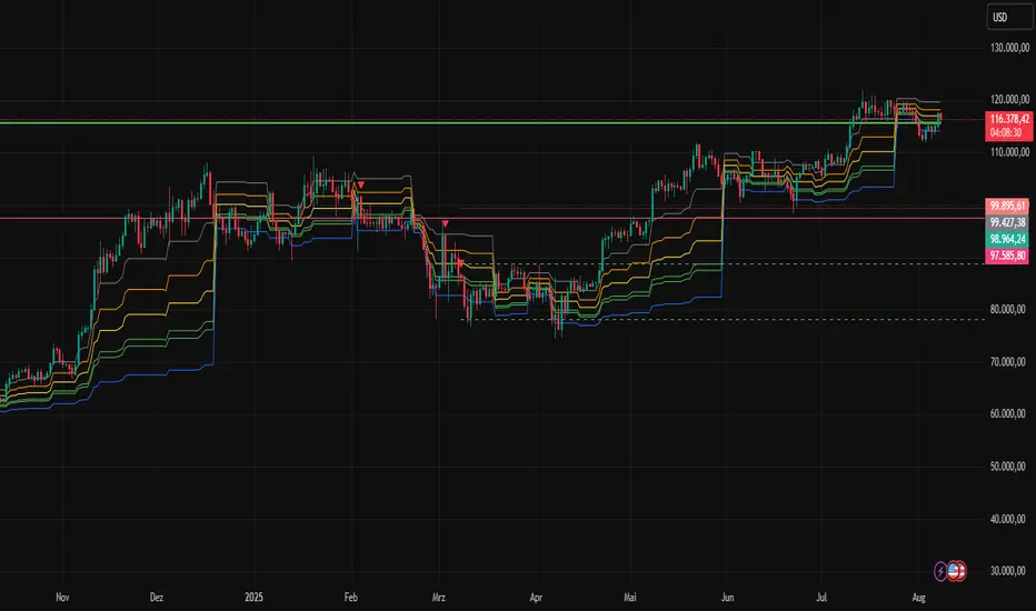 A high-precision Bitcoin-only indicator that combines logarithmic Fibonacci levels, swing points, and dynamic entry/exit zones.