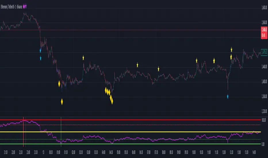 -The pink star and yellow star are strong "short" signals when the LF indicator(NOT STUPID RSI) is above 90.