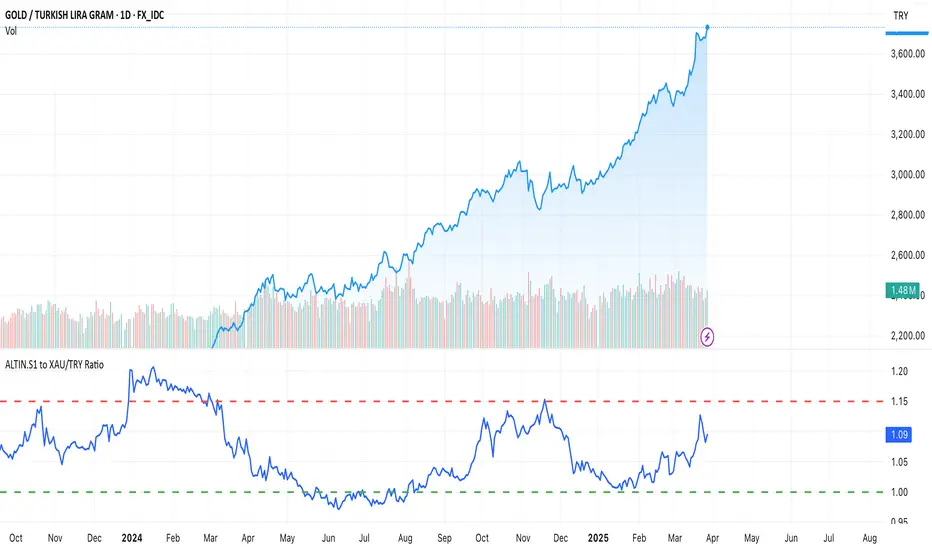 This script calculates the ratio between the Turkish Mint Gold Certificate (ALTIN.S1) and the gold price in TRY (XAU/TRY). It helps traders track the premium or discount of ALTIN.S1 compared to the actual gold price. The script also includes upper (1.15) and lower (1.00) boundary lines for reference.
