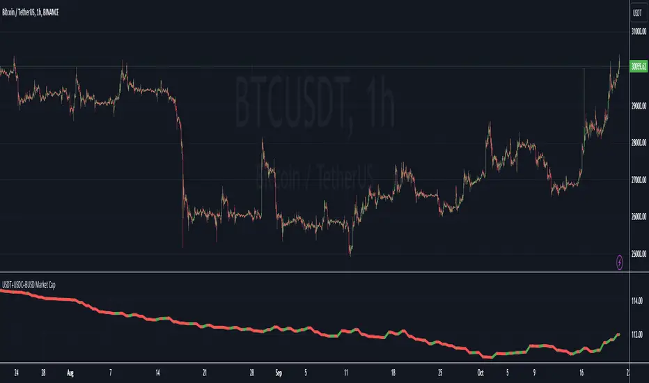 This Pine Script indicator visualizes the combined market capitalization of three prominent stablecoins: USDT, USDC, and BUSD, on a daily basis.