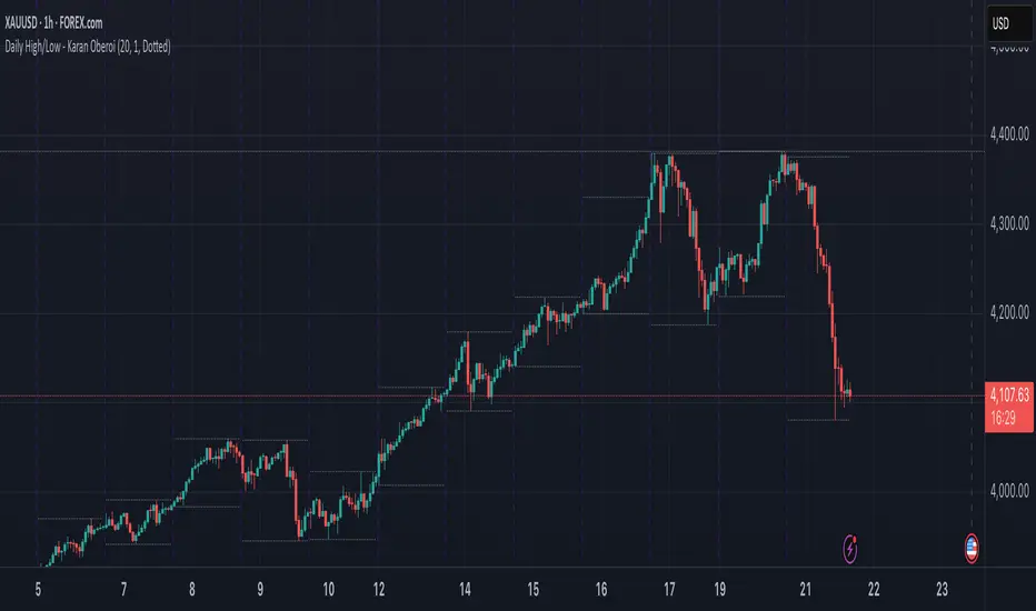 This is perfect for traders who rely on daily range analysis, liquidity sweeps, or intraday reversals — giving you clear, visual reference points of where price previously reached its extremes each session.