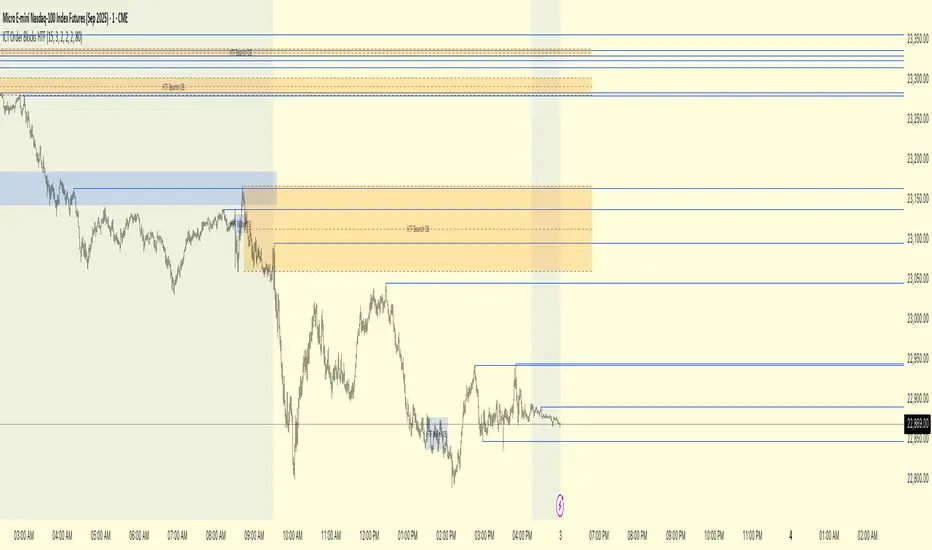 Finds HTF Order Blocks: It looks for bullish (last down-candle) and bearish (last up-candle) order blocks on the higher timeframe you select.