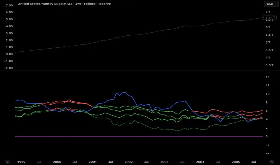 This Pine Script indicator analyzes the annualized growth rate of M2 money supply and compares it to key borrowing rates, providing insights into the relationship between money supply expansion and borrowing costs. Users can select between US M2 or a combined M2 (aggregating US, EU, China, Japan, and UK money supplies, adjusted for currency exchange rates). The M2 growth period is customizable, offering options from 1 month to 5 years for flexible analysis over different time horizons. The indicator fetches monthly data for US M2, EU M2, China M2, Japan M2, UK M2, and exchange rates (EURUSD, CNYUSD, JPYUSD, GBPUSD) to compute the combined M2 in USD terms.