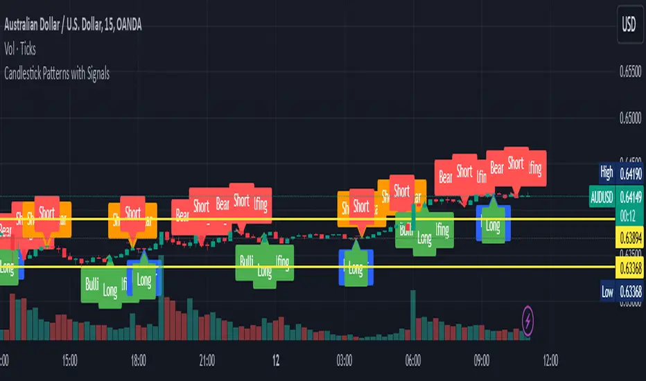 Bullish Engulfing: Indicates potential upward price movement, marked with green labels and lines.