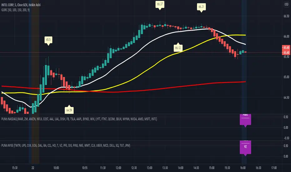 This script is an extension of GORC Indicator, it allows to verify if any of 22 different ticker symbols belowing to Nyse Composite Exchange accomplish with a green candle is over a red candle after a rebound in the exponential average of 20 periods, or had a rebound in teh simple moving average of 50 periods