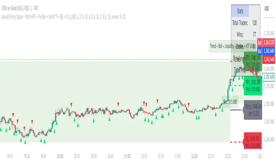 Ayman Entry Signal – With HTF + Pin Bar + Multi TP + BE + Stats Panel (V1)