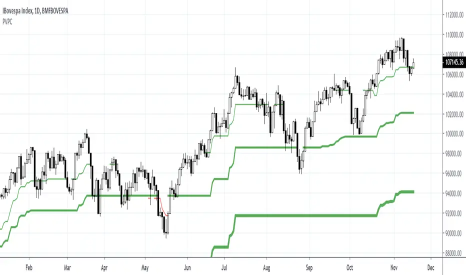 Este indicador PhiCube mostra força para cima quando preço fechar acima da linha PV1, com alvo PV2. A tendência de alta ganha força quando preço fechar acima das linhas PV1 e PV2, com alvo PV3. Preço acima das três linhas PV1, PV2 e PV3 indica muita força. Nesta condição é proibido vender. Força para baixo é sugerida quando preço fechar abaixo da PC1, com alvo PC2. A queda ganha força quando preço fechar abaixo das linhas PC1 e PC2, com alvo PC3. Preço abaixo das três linhas PC1, PC2 e PC3 indica muita força. Nesta condição, é proibido comprar.