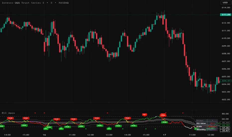RSI Apex is a comprehensive trading system designed to capture both Trend Breakouts and Market Reversals. Unlike traditional RSI indicators that rely solely on fixed levels (70/30), RSI Apex integrates Donchian Channels, Volatility Squeeze, and the Libertus Divergence Algorithm to provide high-probability signals.