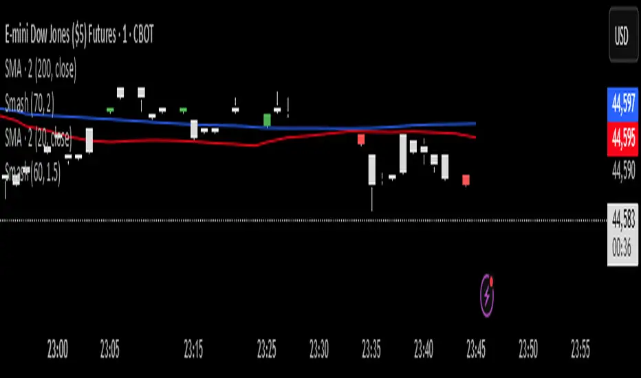 This indicator highlights powerful engulfing candles with strong body momentum and range expansion — what I call a "Smash Candle."It’s specifically optimized for the 1-minute timeframe, and designed to be used in conjunction with the 2-minute 20 and 200 SMAs to determine whether price is in a range or expanding into trend.