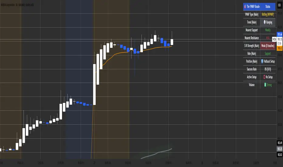 The VWAP Oracle is a sophisticated overlay indicator that elevates VWAP (Volume Weighted Average Price) from a simple benchmark to an intelligent oracle for intraday and swing decisions. It offers flexible anchoring (rolling MVWAP, weekly, monthly, yearly) with session options, augmented by heuristic "AI/ML" elements for trend forecasting, dynamic S/R identification, and mean-reversion pullback strategies. A comprehensive dashboard delivers at-a-glance intel on trends, roles, touch history, and trade stats, complemented by visual zones, entry shapes, and alerts. Tailored for active traders in equities, forex, or futures, this iteration refines state handling and role logic for seamless execution on Pine v6.