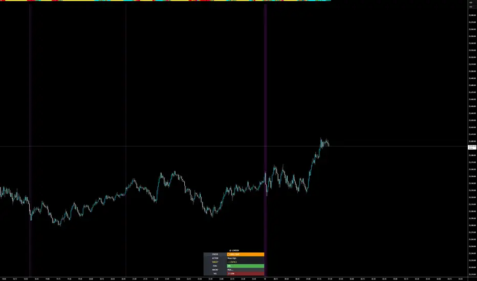 The NQ Logic Engine is a comprehensive market state analyzer specifically designed for the Nasdaq (NQ) but applicable to other high-volatility indices. Rather than providing simple buy/sell arrows, this tool acts as a "Battle HUD," classifying market conditions into actionable scenarios based on session ranges, volume profile, and volatility exhaustion.