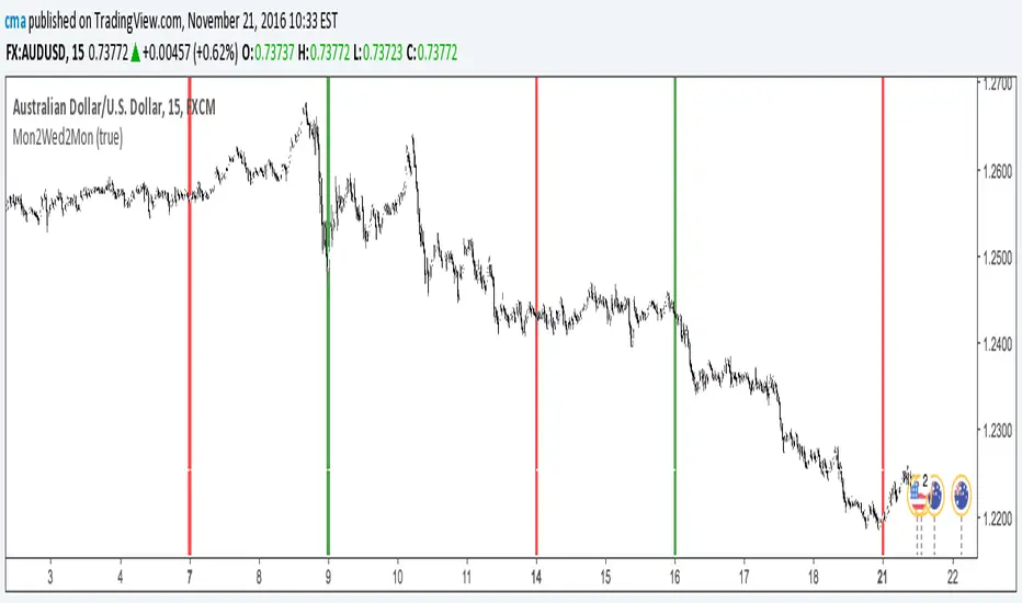 This indicator finds Mondays and Wednesdays and draws a vertical line, so you can easy do your bias or trend analysis.