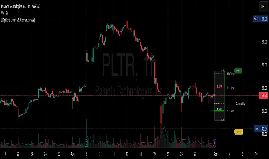 This script is designed to visualize key support and resistance levels derived from options data on TradingView charts. It overlays lines, labels, and boxes to highlight levels such as Put Walls (gamma support), Call Walls (gamma resistance), Gamma Flip points, Vanna levels, and more.