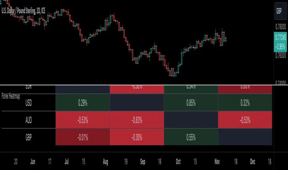 This indicator creates a dynamic grid display of currency pair cross rates (exchange rates) and percentage changes, emulating the Cross Rates and Heat Map widgets available on our Forex page. It provides a view of realtime exchange rates for all possible pairs derived from a user-specified list of currencies, allowing users to monitor the relative performance of several currencies directly on a TradingView chart.