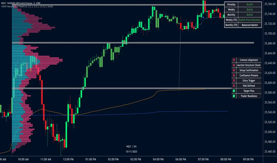 The VWAP Wave System Toolkit helps traders see where market value is forming, shifting, or being rejected across different timeframes. It’s built on the ideas of Auction Market Theory, which views the market as a continuous auction between buyers and sellers searching for fair value. The indicator combines VWAPs, Initial Balance levels, and volume profiles into one system that shows how price interacts with value throughout the day, week, and month. By combining short-term and higher-timeframe data, it helps traders understand when the market is balanced and when it’s starting to discover new price areas.