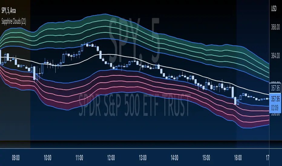 These clouds are built using an SMA, ATR, and Fibs to create a potential high and low type of channel system. The SMA length is customizable via a user input, but the default value is 5.