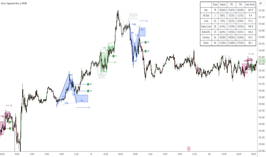 This indicator identifies harmonic patterns by analyzing Zigzag pivot points on the chart and checking if the XABC points form the required Fibonacci retracements/extensions for each particular pattern type.