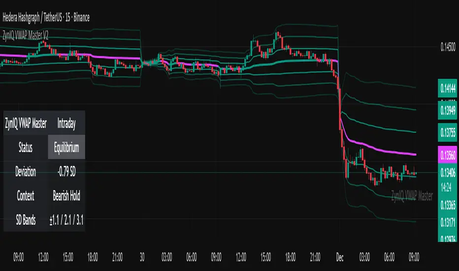 ZynIQ VWAP Master v2 (Lite) provides a clean, structured view of volume-weighted price action using configurable VWAP bands and session-aware logic. It is designed to help traders identify value zones, mean-reversion conditions and directional bias around the VWAP.