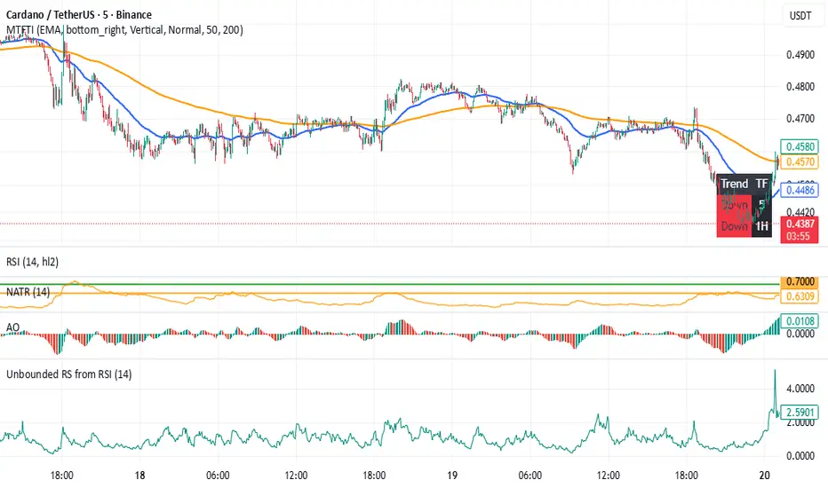 Transforms classic RSI into an unbounded oscillator using a logit transform, reducing 0–100 saturation and making momentum shifts and divergences near overbought/oversold levels much clearer.