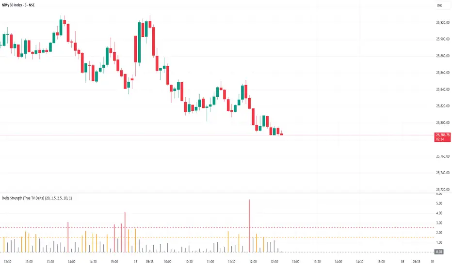 Delta Strength measures the intensity of aggressive trading activity using TradingView’s native Volume Delta engine (ta.requestVolumeDelta).