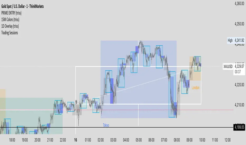 Overlay of the Daily candle, simple one color with a line inside the candle to show direction.
