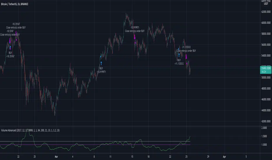 I have found out this script some time ago. In fact it is not my code (just have modified a little) and I don't know the author (couldn't find). So now I would like to share with the community, maybe somebody would have some idea how to make it better. The script itself is modified volatility oscillator (like ATR) based on volume, making a deal at the moment of price change. To recognize the current trend I have add simple function just to compare the current price with the N bars before, because sometimes in moments of high volatility there may be wrong signals.