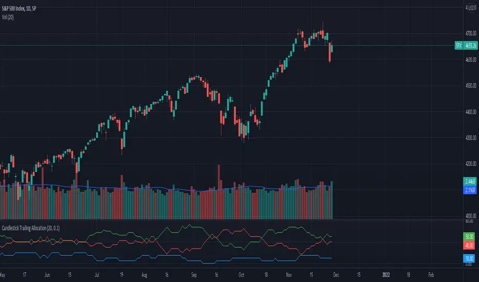 A simple indicator that calculates the sum of 'Up'(green), 'Down'(red), and 'Doji'(near Doji) candlesticks and portrays the same in an allocation format in percentage. And since it is allocation-based, the total will never exceed 100% of the defined Length period.