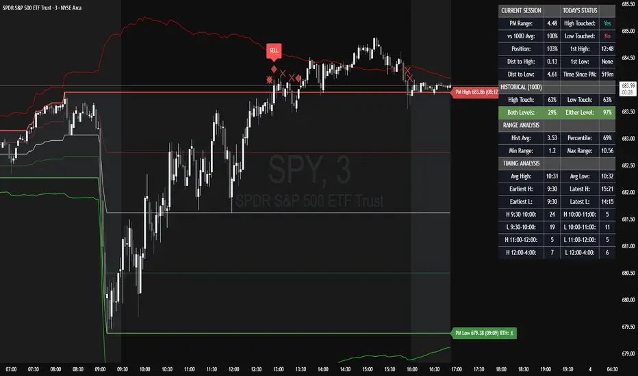This indicator tracks premarket high and low levels for day trading, providing statistical analysis on how often these levels get touched during regular trading hours (9:30 AM-4:00 PM EST). It combines real-time level tracking with historical probability analysis and precise timing statistics to help traders make data-driven decisions. I use 4:00 - 9:30 AM on SPY/QQQ etc and 18:00 - 9:30 on Futures ES/NQ etc