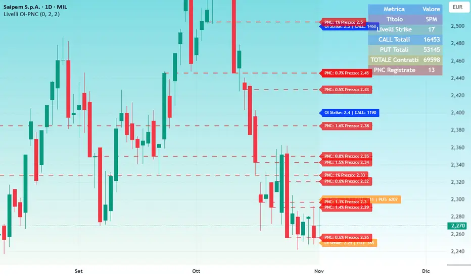 OI-PNC Levels is a script that displays the open interest (OI) and net short positions (PNC) of a selection of 20 of the most significant stocks in terms of traded value on the Italian market.